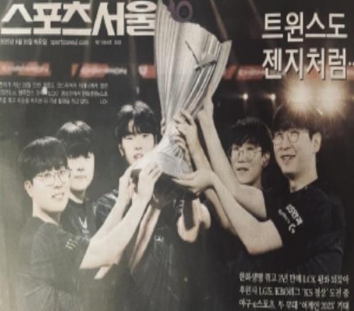 电竞体育9月30报道 LCK总决赛GEN战胜HLE夺得冠军,GEN全员举起冠军奖杯的照片登上了“首尔体育封面”。