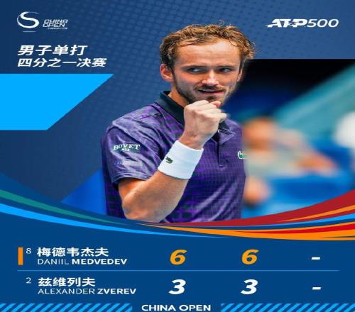 北京时间9月29日,中网四分之一决赛,梅德韦杰夫2-0(6-3、6-3)击败兹维列夫,将双方交战纪录改写为14-7,连续三年在本站闯进四强,这也是他生涯第60个巡回赛四强,他将和勒纳-钱争夺决赛席位。