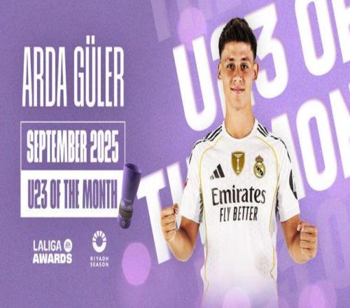 雷速体育9月30报道 西甲官方发布公告,皇马球员阿尔达·居莱尔被评选为西甲九月份最佳U23球员。