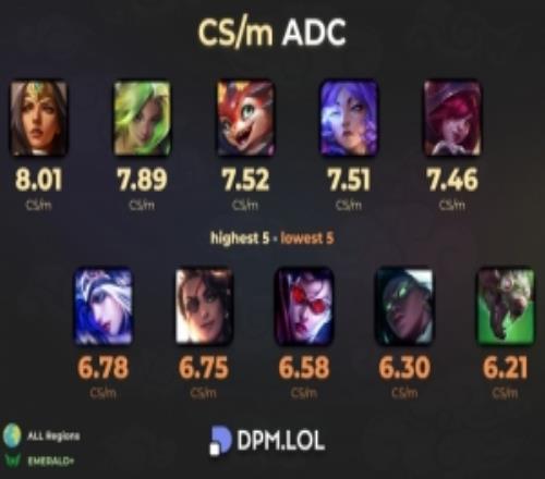 电竞体育10月1报道 根据国外数据网站DPM.LOL统计,当前版本每分钟补刀数最高及最低的ADC: