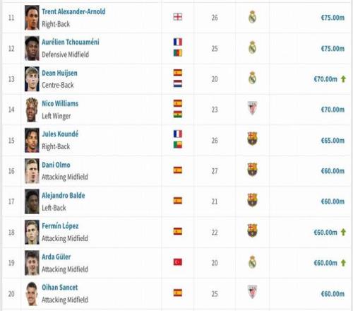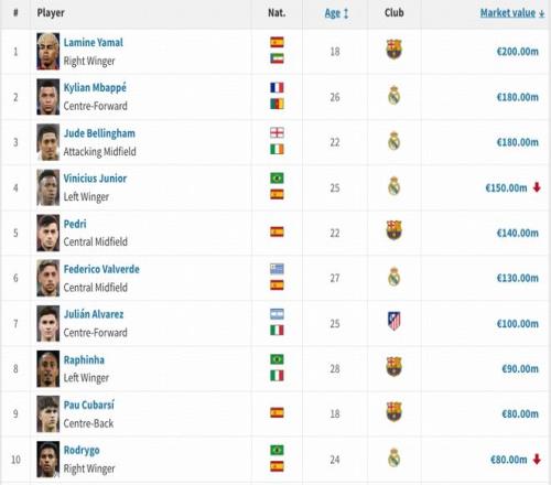 德国转会市场公布最新一期身价,西甲成为五大联赛中首个更新的联赛。前三名亚马尔、姆巴佩、贝林厄姆身价维持不变,维尼修斯身价下跌2000万欧,来到1.5亿欧。
